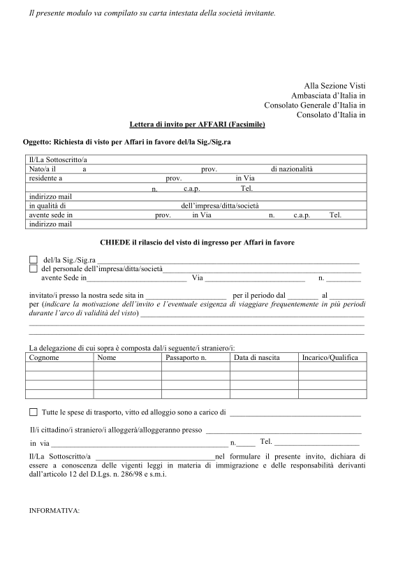 據(jù)意大利駐華使館告,如團(tuán)組以商務(wù)目的申請(qǐng)?jiān)L意簽證,邀請(qǐng)信必須遵照商務(wù)邀請(qǐng)信模板(見(jiàn)附件)格式出具。